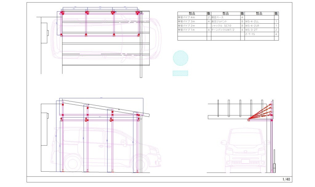 この、カーポート下に、単管パイプ(足場管)を使って、頑丈な棚を作ろうと思い立ったわけです。