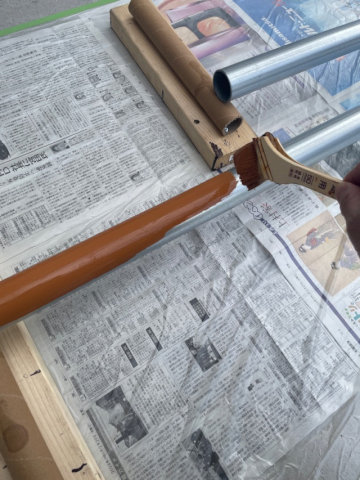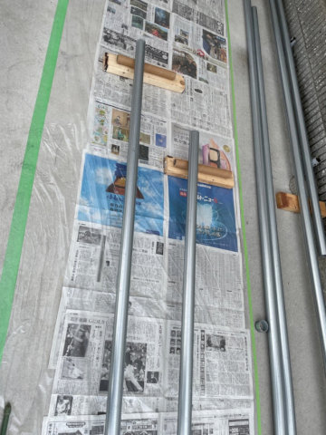 単管パイプそのままだと無骨すぎるので、これに塗装をしていきます。