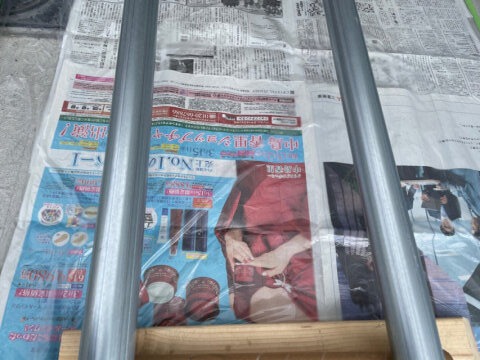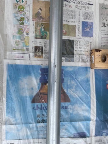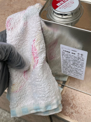 ウエス(きれいな布)にしみこませて、単管パイプを拭いていきます。シリコンオフは揮発性の溶剤なので、換気に注意が必要です。