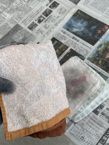 写真では新聞の上にあるウエスにシリコンオフをつけて拭いたのですが、すごい汚れです。