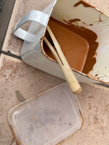 刷毛で塗っていきます。この時に塗料をはじくところは、もう一度脱脂してミッチャクロンを塗り、ペンキを重ねます。目立たないところなら、そのままでもいいのかもしれませんね。