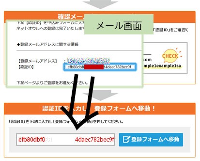 すると、認証IDがメールで通知されますので、フォームに入力して「登録フォームへ移動」をクリックします。