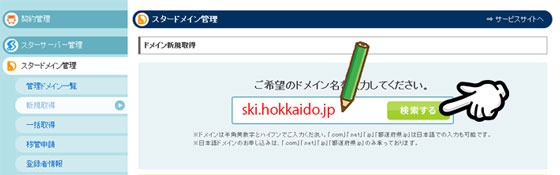 ドメイン新規取得画面が開きますので、ドメイン名を入力してください。ここまでは、ski.hokkaido.jp としています。記入したら、「検索する」をクリックしてください。