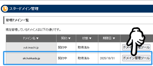 登録したドメインの右端に「ドメイン管理ツール」というボタンがありますので、それをクリックしてください。ドメイン管理ツールが開きます。