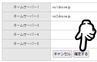 ネームサーバー登録画面が出てきます。さくらインターネット用にネームサーバーを書き換えますので、すべてのネームサーバーを削除して、ネームサーバー1に ns1.dns.ne.jp を、ネームサーバー2に ns2.dns.ne.jp と入力して、「確認画面」ボタンを押してください。