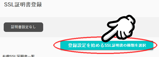 なにやら有償SSLやらの一覧が出てて、お金がかかりそうな気配がしますが、それは見なかったことにして、「登録設定を始めるSSL証明書の種類を選択」をクリックしてください。