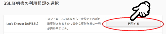 一番上にある、Let's Encrypt(無料SSL)の右端にある「利用する」ボタンをクリックしてください。