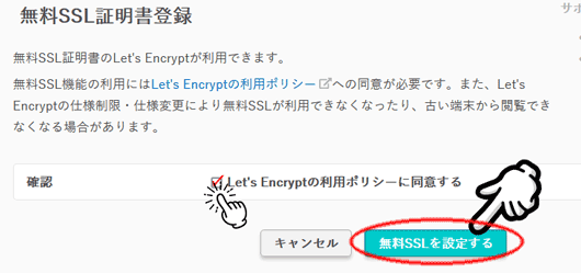 無料SSL証明書登録の画面になりますので、利用ポリシーへの同意にチェックを入れ、「無料SSLを設定する」ボタンをクリックしてください。