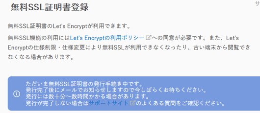 証明書の発行手続きに少し時間が必要です。15分程度でさくらインターネットからメールが来ると思います。