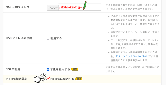 Web公開フォルダは、「 /ski.hokkaido.jp/ 」としてください。最初と最後のスラッシュを忘れずに。
