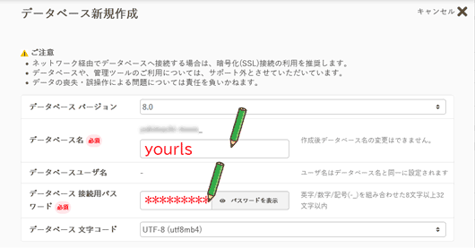 さくらのサーバで設定したデータベース名が入ります。