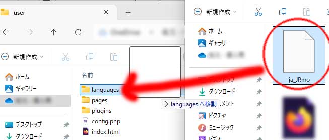 ⑦リネームした ja_JP.mo を、YOURLSのフォルダ内にあるuserフォルダの中の、languagesフォルダに移動します。