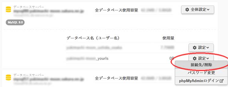データベース名の横にある「設定」→「接続先/削除」をクリックしてください。