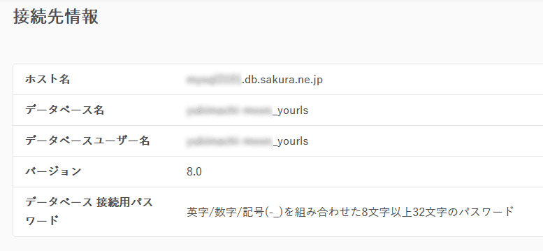 新 define( 'YOURLS_DB_HOST', 'mysql*****.db.sakura.ne.jp' );