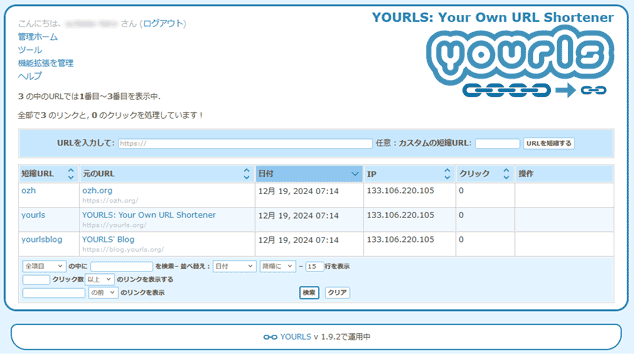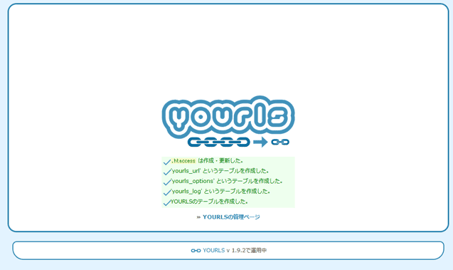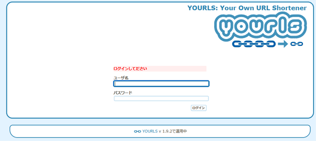 ⑤ロゴ下に動作ログが表示されています。その下に、「YOURLSの管理ページ」というリンクがあるので、クリックしてください。