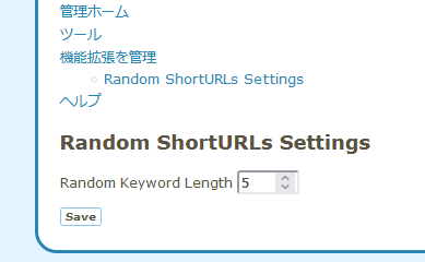 管理ページの左上に「Random ShortURLs Settings」と新しく表示されているので、それを開けば文字列の長さを設定することができます。