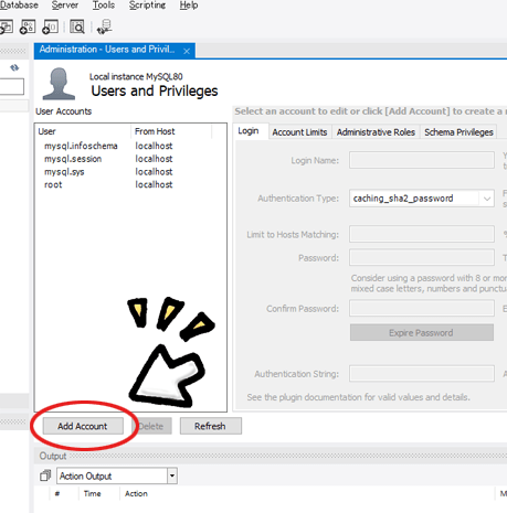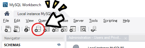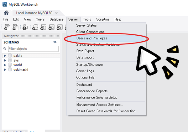画面の上部メニューから「Server」→「Users and Privileges」を選択します。