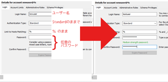 「Limit to Hosts Matching」 … この文字列にマッチするホストからのみ接続を受け付けます。どのホストからも受け付ける場合は % を入力します。