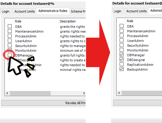 すると、権限設定の画面が表示されますので、左側のグループ(Role)から「 DBManager 」にチェックを入れます。すると、自動的に「DBDesigner」と「BackupAdmin」にチェックが入り、右側のグループ(Global Privileges)にも、自動的にいくつかの項目にチェックが入ります。