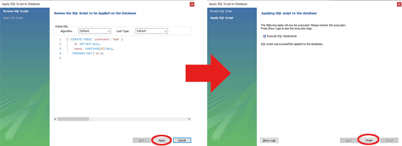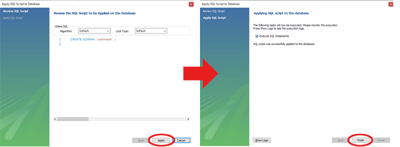 SQL実行のダイアログが表示されるので、「Apply」→「Finish」と進んでください。