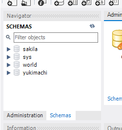 ツリーの中の「yukimachi」をダブルクリックしてください。すると、「yukimachi」が太字表示になり、ツリーが拡張されます。(これでSchemaが選択された状態になります)