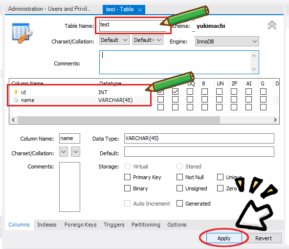 Datatypeについて、ここで詳しく解説することはしませんが、INTは整数型、VARCHAR(45)は最大45文字の文字列を保持できるデータ型です。