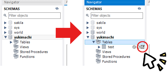 Navigatorウインドウのyukimachiの下にあるTablesに▶がついていると思います。